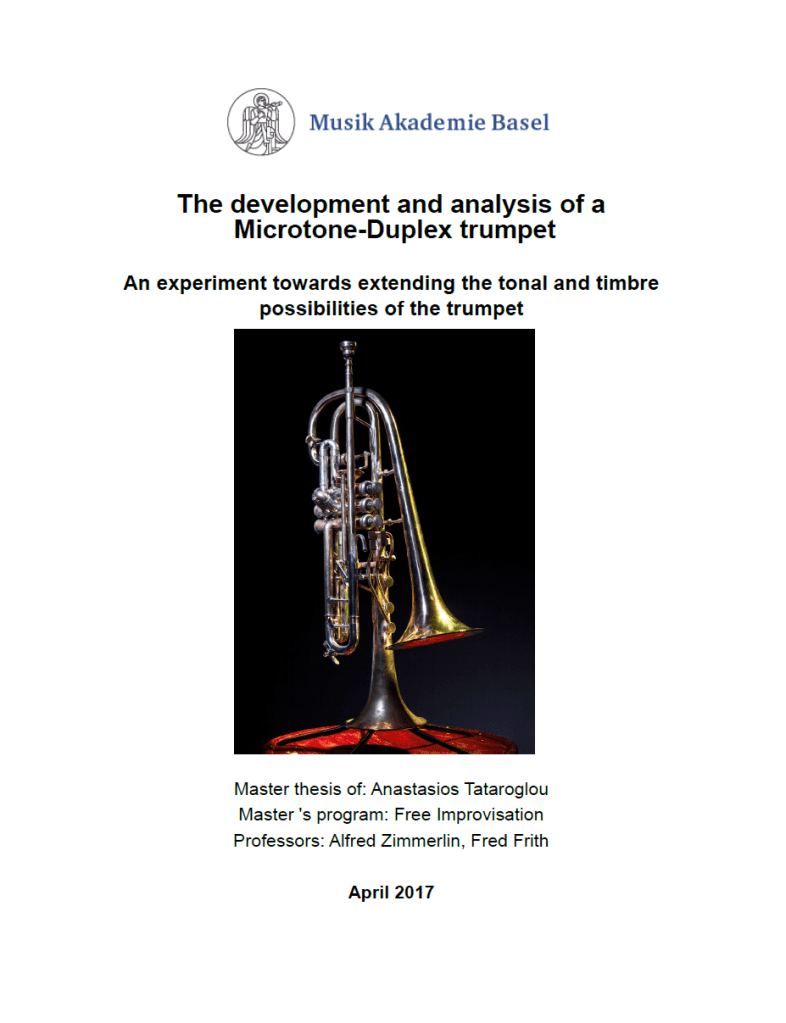 My master thesis “The development and analysis of a Microtone-Duplex trumpet – An experiment towards extending the tonal and timbre possibilities of the trumpet” is available for free download.